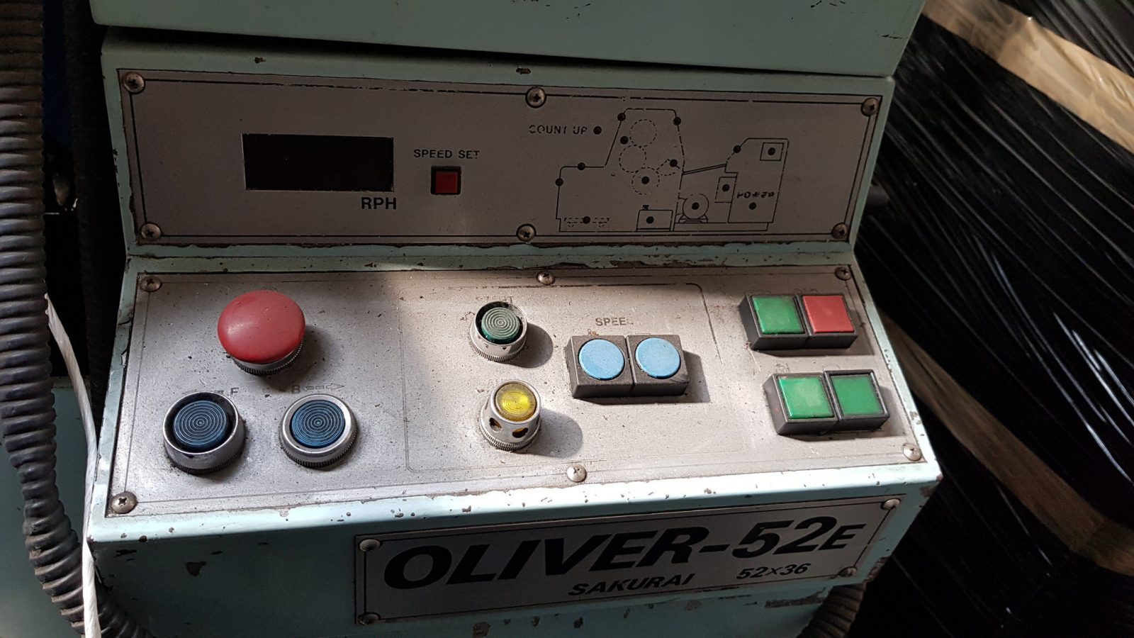 | Mod. Sakurai 52E<>s/n FJ098790<>Manuals and spares are coming with the machine<>Conventional dampening system<>Register control<>Numbering and perforating device<>Powder sprayer<>dismantled |